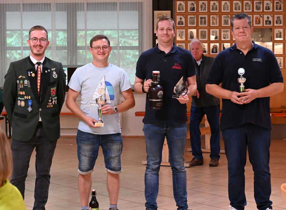 Bei den Erwachsenen entschied die Feuerwehr Petersberg die Mannschaftswertung knapp für sich (191 Ringe) vor dem Turnverein Petersberg (186 Ringe) und den Hauneschiffern (183 Ringe). In der Serie der Einzelschützen war es ein regelrechtes „Fotofinish“: Gleich drei Teilnehmer erzielten 48 Ringe. Über die Platzierungen entschied der jeweils letzte Schuss – und hier bewies Christoph Steffes (Feuerwehr) mit einer 10,4 das beste Nervenkostüm. Er siegte vor Andreas Höch (Hauneschiffer) (10,1) und Andreas Dreifürst (Feuerwehr) (9,8). Den präzisesten Schuss der gesamten Veranstaltung feuerte schließlich Andreas Dreifürst ab: Mit einem Teiler von 11 sicherte er sich das Preisgeld von 100 Euro.